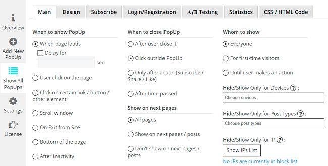 When to close PopUp section provides the ability to set different variations for closing your popup –